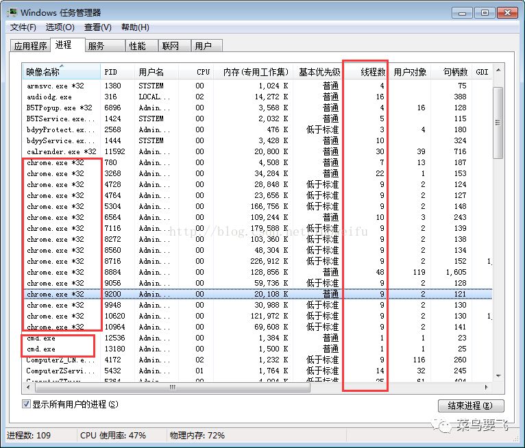 在“进程”选项卡下,我们可以看到一个应用程序包含的线程数。如果一个应用程序有多个进程,我们能看到每一个进程,如在上图中,Google的Chrome浏览器就有多个进程。同时,如果打开了一个应用程序的多个实例也会有多个进程,如上图中我打开了两个cmd窗口,就有两个cmd进程。如果看不到线程数这一列,可以再点击“查看\选择列”菜单,增加监听的列。