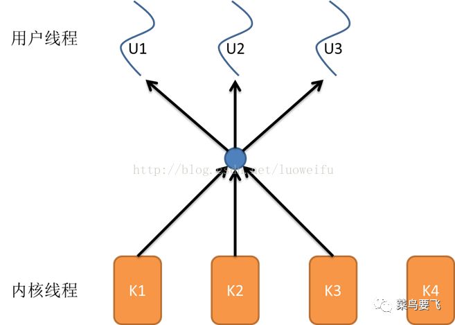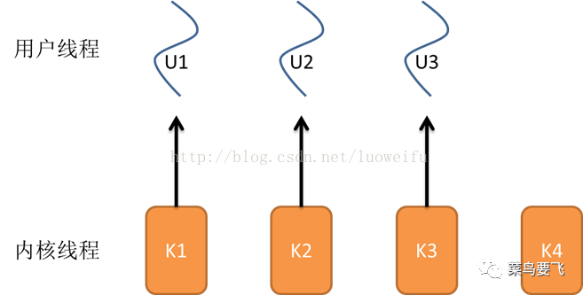 程序一般不会直接去使用内核线程,而是去使用内核线程的一种高级接口——轻量级进程(Lightweight Process,LWP),轻量级进程就是我们通常意义上所讲的线程(我们在这称它为用户线程),由于每个轻量级进程都由一个内核线程支持,因此只有先支持内核线程,才能有轻量级进程。用户线程与内核线程的对应关系有三种模型:一对一模型、多对一模型、多对多模型,在这以4个内核线程、3个用户线程为例对三种模型进行说明。
