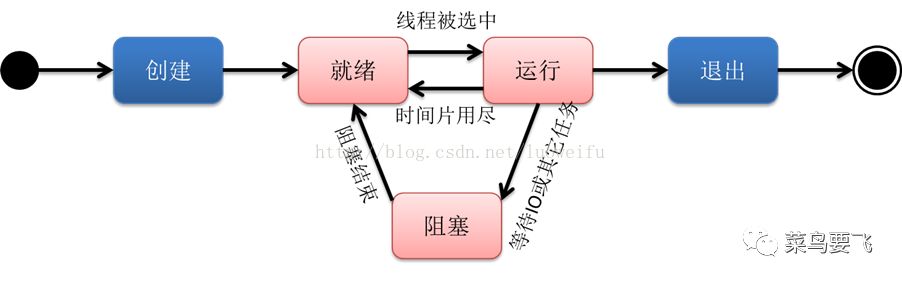 退出:一个线程完成任务或者其他终止条件发生,该线程终止进入退出状态,退出状态释放该线程所分配的资源。