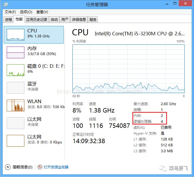 图6:双核四线程在Windows8下查看的结果
