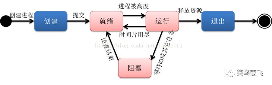 进程在运行过程有三种状态:就绪、运行、阻塞,创建和退出状态描述的是进程的创建过程和退出过程。